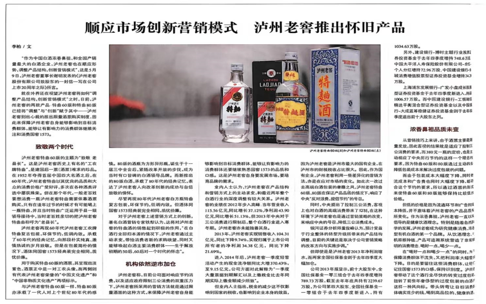 2014年5月30日,《21世纪经济报导》刊发《适应商场立异营销形式 泸州老窖推出怀旧产品》